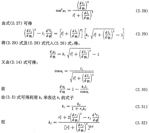 下面再推導(dǎo)一下齒廓及其法向等距線的相對(duì)曲率關(guān)系。設(shè)HJ的孤長參數(shù)為SJ,相對(duì)曲率為kJ,而H1的孤長參數(shù)為S1,相對(duì)曲率為k1,由微分幾何可得: