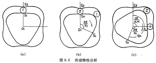單激波推桿減速器的激波器廓形一般使用偏心圓,多激波推桿減速器的激波器廓形是非圓弧曲線。當(dāng)去掉推桿,內(nèi)外滾子合而為一時(shí),推桿減速器就變成了滾柱活齒減速器,如圖6.1所示。因而可以把它們都看作是非圓行星傳動(dòng)機(jī)構(gòu)。這類活齒傳動(dòng)機(jī)構(gòu)的瞬時(shí)傳動(dòng)比是個(gè)常數(shù),如式(2.8)所示,這也是設(shè)計(jì)活齒傳動(dòng)機(jī)構(gòu)必須遵循的準(zhǔn)則。從后面的分析可知,這就決定了活齒傳動(dòng)機(jī)構(gòu)各嚙合副的運(yùn)動(dòng)性質(zhì)都不可能是純滾動(dòng)。因而要在推桿兩端加裝內(nèi)外滾子以增加滾動(dòng)成份而減小滑動(dòng)成份。對(duì)于滾柱活齒減速器來(lái)說(shuō),因?yàn)闈L柱同時(shí)要與激波器、內(nèi)齒圈相接觸,所以一定有一面有滑動(dòng)。因而可以說(shuō)活齒傳動(dòng)是一種滑滾運(yùn)動(dòng)方式的非圓行星傳動(dòng)。由于運(yùn)動(dòng)副是滑滾運(yùn)動(dòng),實(shí)際機(jī)構(gòu)不能使用輪齒進(jìn)行傳動(dòng),而是靠相嚙合的兩個(gè)輪的光滑表面接觸。
