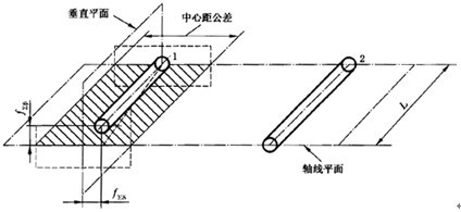 “軸線平面內(nèi)的偏差” f∑δ是在兩軸線公共平面上測量的,這公共平面是用兩軸承跨距中較長的一個L和另一根軸上的一個軸承來確定的,如果兩個軸承的跨距相同,則用小齒輪軸和大齒輪軸的一個軸承!按怪逼矫嫔系牡钠睢 f∑δ是在與軸線公共平面相相垂直的“交錯軸平面”上測量的。