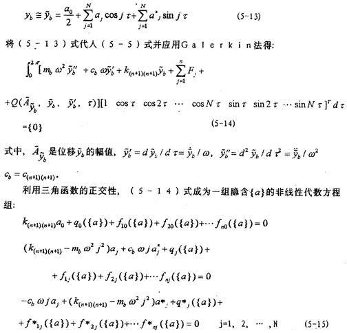 +1個(gè)未知量[a0  a1  T。由(5-15)式可知,它不同于一般的非線性方程組,在一般的非線性方程組中,未知量是顯含的,而(5-15)式的未知量{a}是隱含的,而且{q}是{a}的非線件函數(shù)。不能通過將yb的傅立葉展開式代人恢復(fù)力O的表達(dá)式中來直接求得,這是因?yàn)镼表達(dá)式中的振幅 不能表示成{a}的顯函數(shù)的緣故。因此要想由(5-1)式解得{a},還需要解決兩個(gè)問題:一是如何求 ,二是用什么來解隱含{a}的方程組(5-15)。下面就決這些問題。