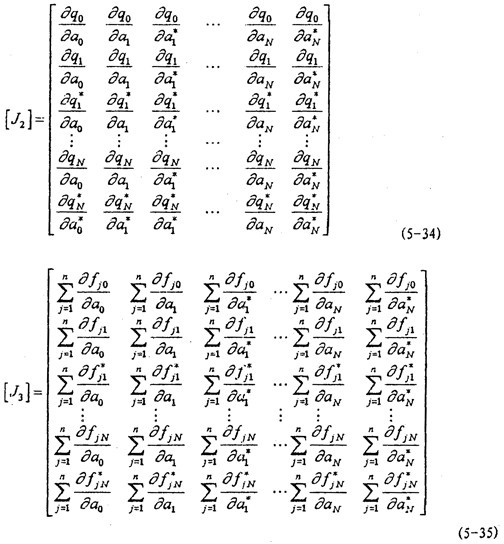 [J3]的計(jì)算實(shí)際上就是偏導(dǎo)數(shù) {fj({ a(k)})}/ { a(k)}的計(jì)算。計(jì)算方法與計(jì)算 {q({ a(k)})}的方法類似,故不再贅述。對(duì)于[J2],[J3]、分別有式(5-34)、(5-35)。