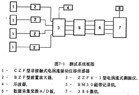 如圖6-l所示,實驗臺安裝在一個4噸重的鋼質(zhì)平臺上,兩個球面球軸承支座1支承一根直徑為30毫米,長度為1500毫米的等直徑軸3,兩軸承座中間的袖上裝有一個直徑為300毫米,厚度為50毫米的圓盤2,軸的外伸端與調(diào)速電動機5之間有鋼絲繩聯(lián)軸器4相聯(lián)。在圓盤外緣以及在聯(lián)抽器從動端(內(nèi)套)與袖外伸端聯(lián)結(jié)處的水平和垂直方向各安裝一個非接觸式電渦流振動位移傳感器6。測試系統(tǒng)框圖如圖7-1所示。