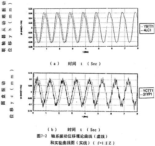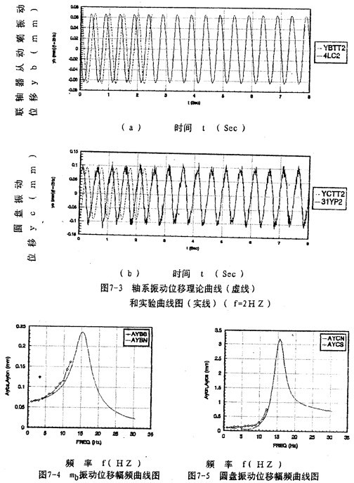 測量數(shù)據(jù)進行分析處理后,結(jié)果如圖7-2~圖7-5所示。圖7-2a)~(b)和圖7-3a)~(b)分別給出調(diào)速頻率為1。2赫茲時圓盤和聯(lián)軸器從動端y方向的振動位移時域曲線,圖7-4、圖7-5分別給出聯(lián)軸器從動端、圓盤y方向的振動位移的理論和實驗幅頻曲線圖(實線為理論曲線,圓點線為實驗曲線),總的來看,理論與實驗結(jié)果較好地重合。然而,在某些頻率點處,振運位移幅值的理論計算與實驗結(jié)果相差值,雖然絕對值差異并不大,但從相對值來講,差異較大,這是由于軸系還受到諸多因素,如軸承認、軸承、電動機等振動的相互影響;當然,測試儀器,數(shù)據(jù)處理都有可能產(chǎn)生誤差。由圖7-2、7-3還可以看到,理論計算與實驗所得的振動位移時域曲線之間存在著相位差,這是因為采集數(shù)據(jù)時,時域曲線的相位不能保證與理論計算相位一致造成的,但這不影響兩者的本質(zhì)特性。