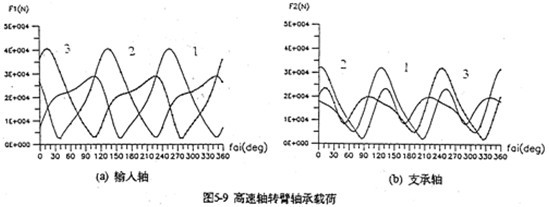 4.輸出軸的行星軸承總體載荷比支承軸行星軸承總體載荷大(圖5-9),特別是輸入軸X方向受力最大。輸入軸行星軸承載荷在死點附近取得最小值,在φ=105°、255°取得極大值。極大值產(chǎn)生的位置正好是機構(gòu)傳動角最佳位置附近。在同一時刻,齒板上各輸入軸行星軸承的受力狀況是不是一樣的。當(dāng)某一齒板接近其死點位置時,軸承載荷較小,而同時另外兩片遠(yuǎn)離死點位置的齒板上輸入軸行星軸承載荷要大得多。支承軸的軸承載荷在一個周期內(nèi)分別出現(xiàn)三次極大值和三次極小的值。由于這個原因使支承軸偏心套的微動磨損比輸入軸偏心套的微動磨損更為嚴(yán)重。行星軸承載荷的最大值為