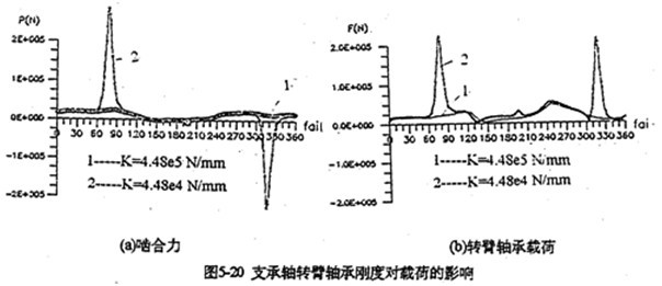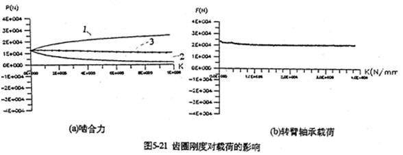 只考慮行星軸承變形及齒板變形時,影響三環(huán)減速器載荷特性的剛度,主要是行星軸承剛度、和內(nèi)齒圈的變形剛度。軸承剛度與軸承材料、間隙、油膜等很多因素有關(guān)。圖5-19是輸入軸行星軸承剛度對嚙合力及行星軸承載荷的影響。當(dāng)輸入行星軸承剛度小一個數(shù)量級時,負(fù)向嚙合力區(qū)域增大(見圖5-19a);隨剛度減小、各相嚙合力越不均恒(圖5-19b),輸入軸行星軸承剛度的影響比輸入軸行星軸承剛度更大,見圖5-20所示。嚙合力及各行星軸承載荷在軸承剛度較小的情況時,都出現(xiàn)正常載荷的10倍以上的沖擊現(xiàn)象,沖擊產(chǎn)生的位置隨剛度變化不同。內(nèi)齒圈剛度對載荷的影響與行星軸承剛度相反(見圖5-21所錄)。當(dāng)剛度越小時,三相齒板的嚙合力越均恒(見圖5-21a),而且行星軸承載荷幅值基本上不變(見圖5-21b)。同此可推知,減小三環(huán)減速器振動的途徑之一就是提高行星軸承剛度,減小內(nèi)齒圈剛度。這可以通過對行星軸承進行預(yù)緊,和采用軟齒面或大柔度齒圈的辦法,以使嚙合力和行星軸承載荷均衡化,以達(dá)到減振降噪的目的。