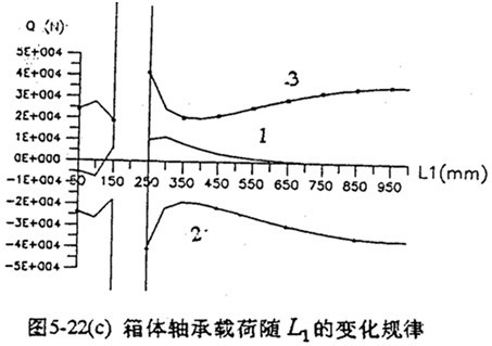 當(dāng) 時,載荷產(chǎn)生沖擊為無窮大,L1≥400mm以后,隨著L1的增加,三相行星軸承載荷幅值變化很緩慢,接近于直線分布。但箱體軸承載荷的幅值在L1>350mm后,隨L1增加各相之間的幅值差變大,趨于不均衡狀態(tài)(見圖5-22c)。因此SHQ50型及SHQ63型的三環(huán)減速器的振動比SHQ40型的大。