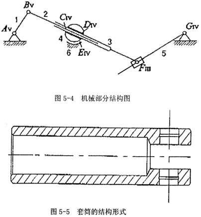 首先將原來(lái)的原理圖轉(zhuǎn)換成以下的機(jī)構(gòu)結(jié)構(gòu)圖(僅部分轉(zhuǎn)換),如圖5-4,即原來(lái)23構(gòu)件之間是滑塊和連桿連接,現(xiàn)改為連桿、套筒改為加一個(gè)擺動(dòng)軸結(jié)構(gòu),原來(lái)滑塊3和地面連接,容易形成過(guò)約束,改為加一個(gè)擺動(dòng)軸承4來(lái)和地面、套筒來(lái)連接。擺動(dòng)軸承內(nèi)芯相當(dāng)于一個(gè)球副,其轉(zhuǎn)動(dòng)中心必為內(nèi)芯的球心,當(dāng)然也是整個(gè)擺動(dòng)軸承的中心。這樣便于加工查和實(shí)驗(yàn)實(shí)施,而且更重要的是可防止原來(lái)原理圖中桿件連接出形成過(guò)約束。