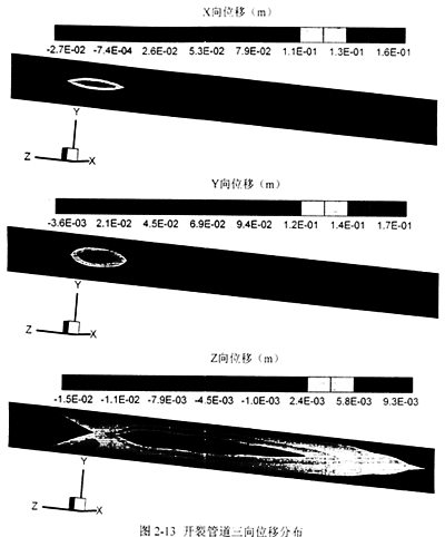 圖2-13分別按照三個(gè)方向上的位移分布在開裂前管道表面畫出云紋圖。從圖中可以看到,此種設(shè)計(jì)參數(shù)下的位移量主要發(fā)生在裂尖附近5m左右的區(qū)域,對(duì)遠(yuǎn)端的影響較小。