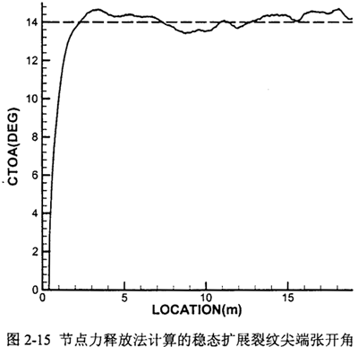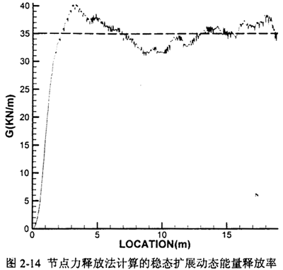 圖2-14反映了節(jié)點(diǎn)力釋放法計(jì)算的動(dòng)態(tài)能量釋放率與裂尖位置的關(guān)系,其結(jié)果因前面提到過(guò)的有限元算法的原因而略有抖動(dòng),G的穩(wěn)態(tài)值約35KN/m,遠(yuǎn)高于X70鋼材的斷裂韌性Gd<10KN/m。