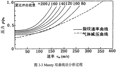 雙曲線法的具體分析過程如圖3-3所示,坐標橫軸表示速度,縱軸表示氣體壓力或環(huán)向應力。上方的一組曲線表征不同韌性水平下的斷裂速度,是內(nèi)壓或環(huán)向應力的函數(shù)。隨著內(nèi)壓或環(huán)向應力在斷裂過程中的減小,斷裂速度不斷降低。如果壓力或應力足夠低,斷裂速度即減小到零而發(fā)生止裂。