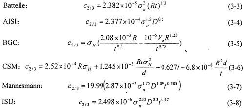 在雙曲線法的基礎上,結(jié)合大量的實驗結(jié)果對止裂韌性進行標定,世界各大研究機構(gòu)分別給出了簡便易算的經(jīng)驗公式用以估算臨界止裂韌性,列舉如下: