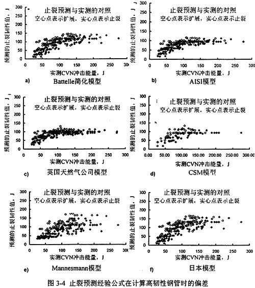 圖3-4表示了Battelle應用Maxey雙曲線法對全尺寸實驗數(shù)據(jù)庫所做的DDF止裂韌性預測,圖3-4a至圖3-4f分別對應于式(3-3)至式(3-8)。圖中顯示的實驗用管的鋼級包括X52到Xl00,管徑范圍從4O6mm到1422mm,實驗最高壓力超過16MPa?梢,預測模型在管材韌性低于某一水平時預測結(jié)果與實物實驗結(jié)果基本吻合,但當管材韌性較高時出現(xiàn)明顯偏差,預測應該止裂的管線沒有止裂。經(jīng)典的止裂預測模型在預測夏比能量值高于94J的管材時,已經(jīng)偏于危險,即過高估計了管材的止裂性能。