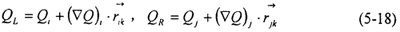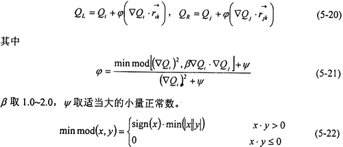 但是,由(5-18)直接得到的格式在激波附近是不穩(wěn)定的,將會出現(xiàn)非物理振蕩。迎風格式通過限制物理量的梯度值,來保證物理量在單元內(nèi)的分布具有單調(diào)性,從而達到抑制間斷附近非物理振蕩的目的。這時,(5-18)式變?yōu)?/p>