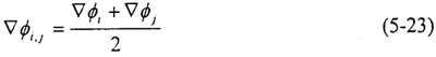 粘性通量由控制面上的速度、壓力及密度的梯度項組成,所以粘性通量的計算主要是求出控制面上相關物理量的梯度值。首先由(5-19)式求出各單元內(nèi)物理量ф的梯度值后,界面(i,j)上物理量的梯度值可簡單地由相鄰單元內(nèi)物理量ф的梯度值的算術平均得出: