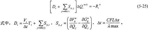 方程(5-24)可以采用顯式或隱式的方法進(jìn)行求解。但是由于受時(shí)間步長(zhǎng)的限制,采用顯式的R-K時(shí)間推進(jìn)方法需要迭代的步數(shù)較多,計(jì)算很不經(jīng)濟(jì),因此本文采用了Gauss-Seidel迭代隱式求解的方法。