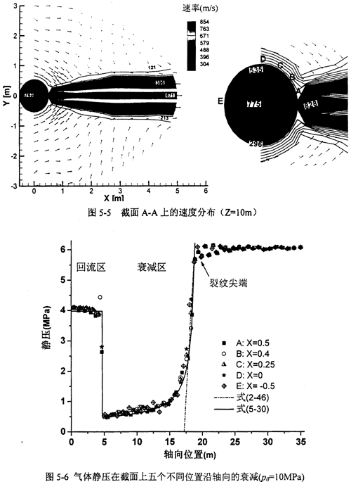 對(duì)含動(dòng)態(tài)裂紋的高壓輸氣管道的流場(chǎng)模擬結(jié)果表明,氣體壓力模式(2-46)和(2-47)式在裂紋充分發(fā)展至不考慮回流區(qū)影響的條件下,對(duì)高壓高韌性管道仍然成立