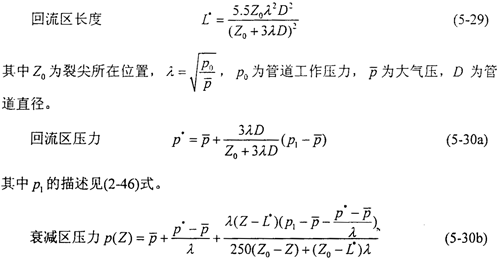 其三是衰減區(qū)的壓力變化。氣流通過裂紋尖端時(shí),管壁上作用的氣體壓力沿軸向迅速衰減,經(jīng)驗(yàn)公式(2-47)中所用的衰減長(zhǎng)度一般取為1.5倍管道直徑,最終衰減到零。計(jì)算表明衰減長(zhǎng)度隨管道工作壓力的升高而增加,并且衰減區(qū)壓力的最低值與管道的工作壓力相關(guān)。由于對(duì)裂紋的擴(kuò)展?fàn)顟B(tài)影響甚微,裂尖前部的壓力不是關(guān)心的對(duì)象。