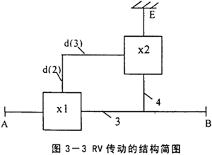 為計(jì)算RV傳動(dòng)的傳動(dòng)比,將上述的傳動(dòng)簡(jiǎn)圖用圖3-3所示的結(jié)構(gòu)簡(jiǎn)圖代替。該機(jī)構(gòu)簡(jiǎn)圖包括兩個(gè)簡(jiǎn)單行星機(jī)構(gòu):x1和x2。輸出件A為中心輪1,輸出件B為輸出盤6,且有ω6=ω4。支承件E為針輪7,漸開線行星輪2與轉(zhuǎn)臂(曲柄軸)3均為輔助件d。
