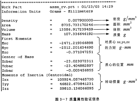通過UG強(qiáng)大的質(zhì)量屬性檢驗(yàn)功能,可獲得每個(gè)零件及整個(gè)模型的密度、體積、質(zhì)量和慣量等必要信息。上圖3-7是所獲得的擺線輪的相關(guān)信息。