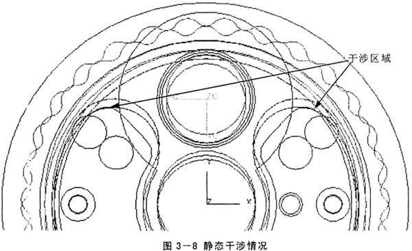 后三種都是實(shí)際結(jié)構(gòu)可能存在的,當(dāng)出現(xiàn)第一種干涉即硬干涉時(shí)就要引起高度重視,這可能是:設(shè)計(jì)存在問題,必須及時(shí)糾正。就是借助此功能,造型完成后,本人發(fā)現(xiàn)輸出盤與擺紅、輪間有硬干涉(見圖3-8),與設(shè)計(jì)此減速器的部門交換意見,原來(lái)他們?cè)谠O(shè)計(jì)完后沒有發(fā)現(xiàn)此問題,等制造出成品后才發(fā)現(xiàn),便通過手工磨削將干涉部分除去。此處也充分體現(xiàn)了與傳統(tǒng)的設(shè)計(jì)方法相比,虛擬樣機(jī)技術(shù)有著不可比擬的優(yōu)越,即在制造第一臺(tái)物理樣機(jī)前就發(fā)現(xiàn)了機(jī)構(gòu)在結(jié)構(gòu)方面的缺陷。至于機(jī)構(gòu)的優(yōu)化和性能改進(jìn)方面,通過后面的仿真分析更能清楚地展現(xiàn)虛擬樣機(jī)技術(shù)的優(yōu)越。