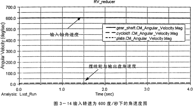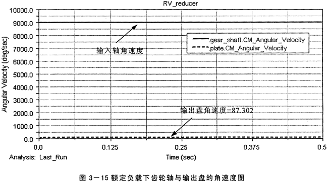 按RV減速器傳動(dòng)比的理論計(jì)算公式i16=1+(z2/z1)Z7,由村課題所研究的RV減速器的參數(shù):Z2=34,Z1=10,Z7=30,計(jì)算得到總的傳動(dòng)比為103,而由仿真得到的傳動(dòng)比在圖3-8中為i=3000/29.12=103.02,在圖3-9中為i=600/5.829=102.93,且圖中擺線輪與輸出盤的角速度相等說明輸出部分施加的約束滿足等角速度輸出原理。