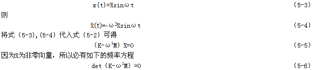 若無外力作用,即f(t)=0,則得到系統(tǒng)的自由振動方程。在求結構自由振動的頻率和振型即求結構的固有頻率和固有振型時,阻尼對它們影響不大,因此,阻尼項可以略去,這時無阻尼自由振動的運動方程為