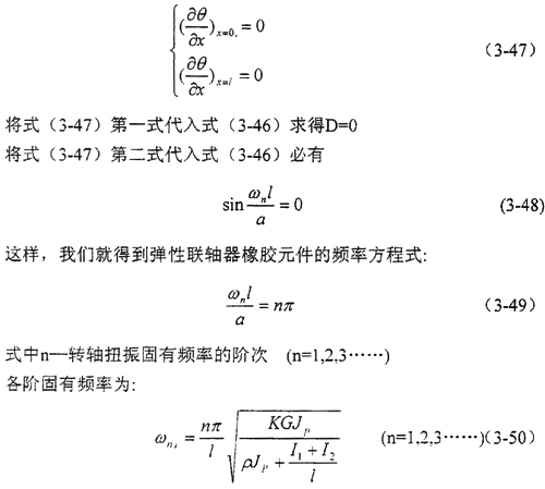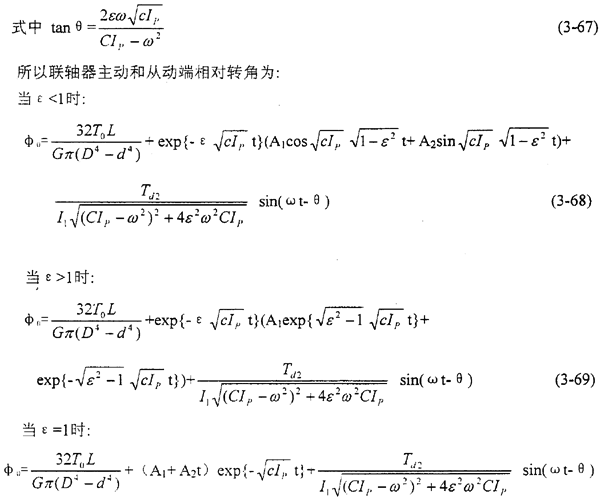 比較式(3-74),(3-75),(3-76)可知,由于 ,所以當阻尼系數(shù)等于臨界阻尼系數(shù)時,產(chǎn)生的剪切應力最小,此時 。由于對于一定的材料制作的聯(lián)軸器,因為材料的阻尼特性是一定的,因此在以后聯(lián)軸器的設計過程中,可以通過控制兩端的轉動慣量,或者通過改變聯(lián)軸器本身的尺寸來控制它的扭轉剛度,力求使 的值盡可能的接近阻尼系數(shù),從而減少產(chǎn)生的剪切力,提高聯(lián)軸器的工作狀態(tài)和延長聯(lián)軸器的使用壽命。