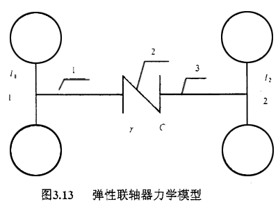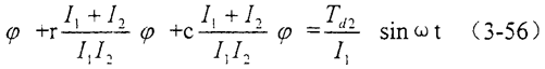 現(xiàn)單獨考慮擾動轉矩產(chǎn)生的相對轉角φ2,目前國內(nèi)建立了圖3.13所示力學模型[2],出于橡膠件相對于兩側的鐵圈剛性很小,現(xiàn)假設:(1)只有聯(lián)軸器兩側的鐵圈具有剛性,只有橡膠具有彈性和阻尼;(2)聯(lián)軸器主動側作用有按簡諧規(guī)律變化的擾動轉矩分量Tdlsinωt此時按照動量矩定理,按聯(lián)軸器兩側力矩平衡條件,可以分別列出兩個圓盤的轉動運動方程式,即系統(tǒng)振動的微分方程是: