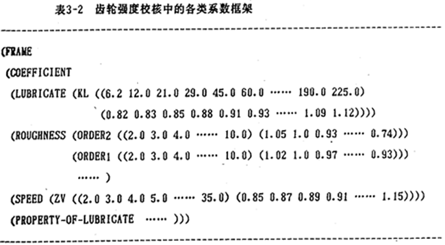 (2)圖表知識(shí)的數(shù)據(jù)化:圖表知識(shí)的數(shù)據(jù)化過程是首先將圖表進(jìn)行離散處理,然后,再對(duì)離散數(shù)據(jù)按數(shù)表型知識(shí)進(jìn)行處理。表3-2是齒輪強(qiáng)度校核中的各類圖表系數(shù)數(shù)據(jù)化后用框架形式表達(dá)的知識(shí)。其中,有潤滑劑(lubricator)系數(shù)KL,粗糙度(roughness)系數(shù)orderl (淬火齒面)、order2(調(diào)質(zhì)齒面),……。