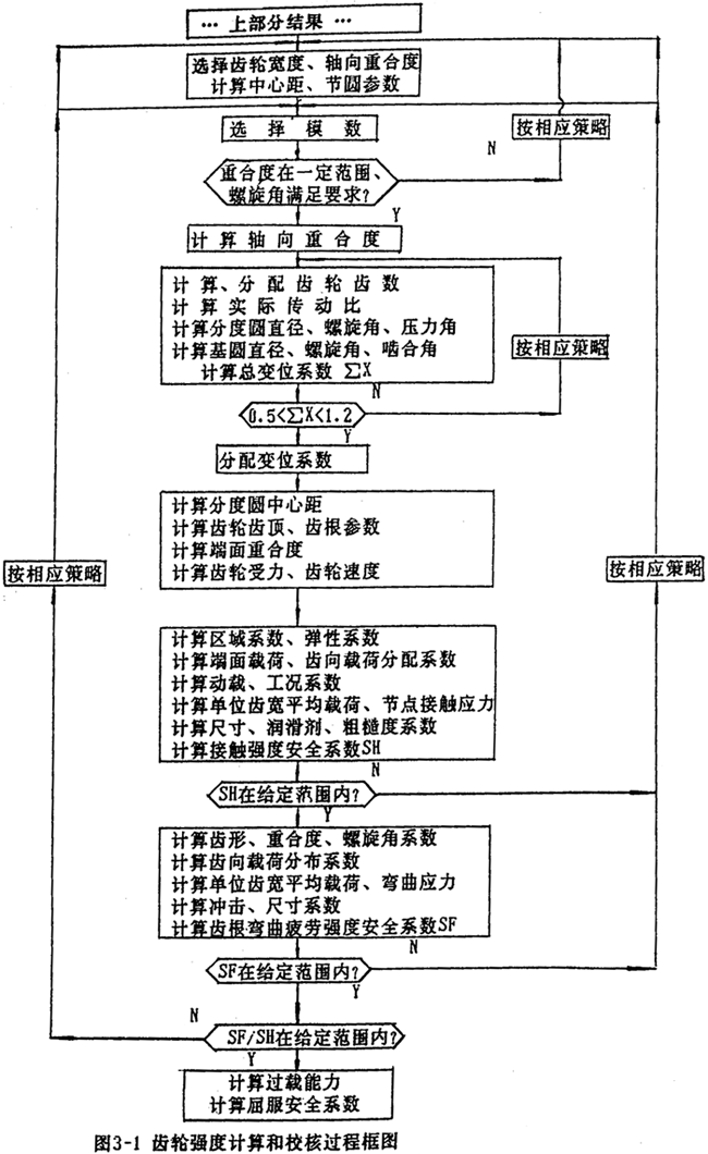 以上所討論的知識(shí)表達(dá)的各種方式均是建立在一定格式的基礎(chǔ)上的,可以說是知識(shí)的描述性(declarative)表達(dá)方式。這類知識(shí)的表示一般具有模塊性,自然性,清晰性等。但正是由于格式的限制,因此對(duì)于某些功能,如回溯、反復(fù)的校核計(jì)算等這樣一類操作,不如用語言編寫知識(shí)過程來得方便。用語言形式直接編寫知識(shí)過程,便有了圓柱齒輪減速器設(shè)計(jì)知識(shí)的過程表示?驁D3-l是齒輪強(qiáng)度計(jì)算、校核的過程框圖,這樣一個(gè)過程需要多次重復(fù)的計(jì)算。使用過程表示可使求解過程按照嵌入的程序次序進(jìn)行調(diào)用,它們不需要和選擇那些不相關(guān)的知識(shí),也不需要那些不自然的推理路徑。同時(shí),還能夠把領(lǐng)域特有的,導(dǎo)致更為直接推理過程的啟發(fā)性知識(shí)結(jié)合到設(shè)計(jì)過程中去,因而能夠大幅度地提高運(yùn)行效率。