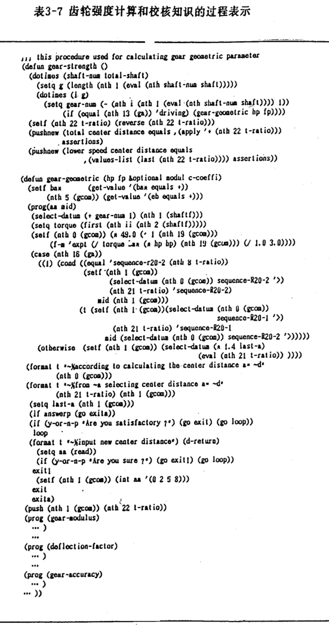 在LlSP語言中,過程表示用函數(shù)表達(dá),表3-5是圖3-l所示的齒輪強(qiáng)度計(jì)算和校核知識(shí)的過程表示的形式。